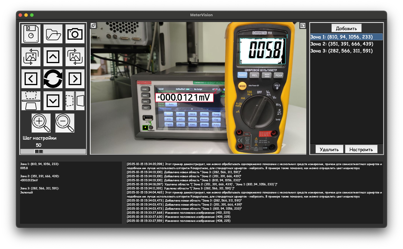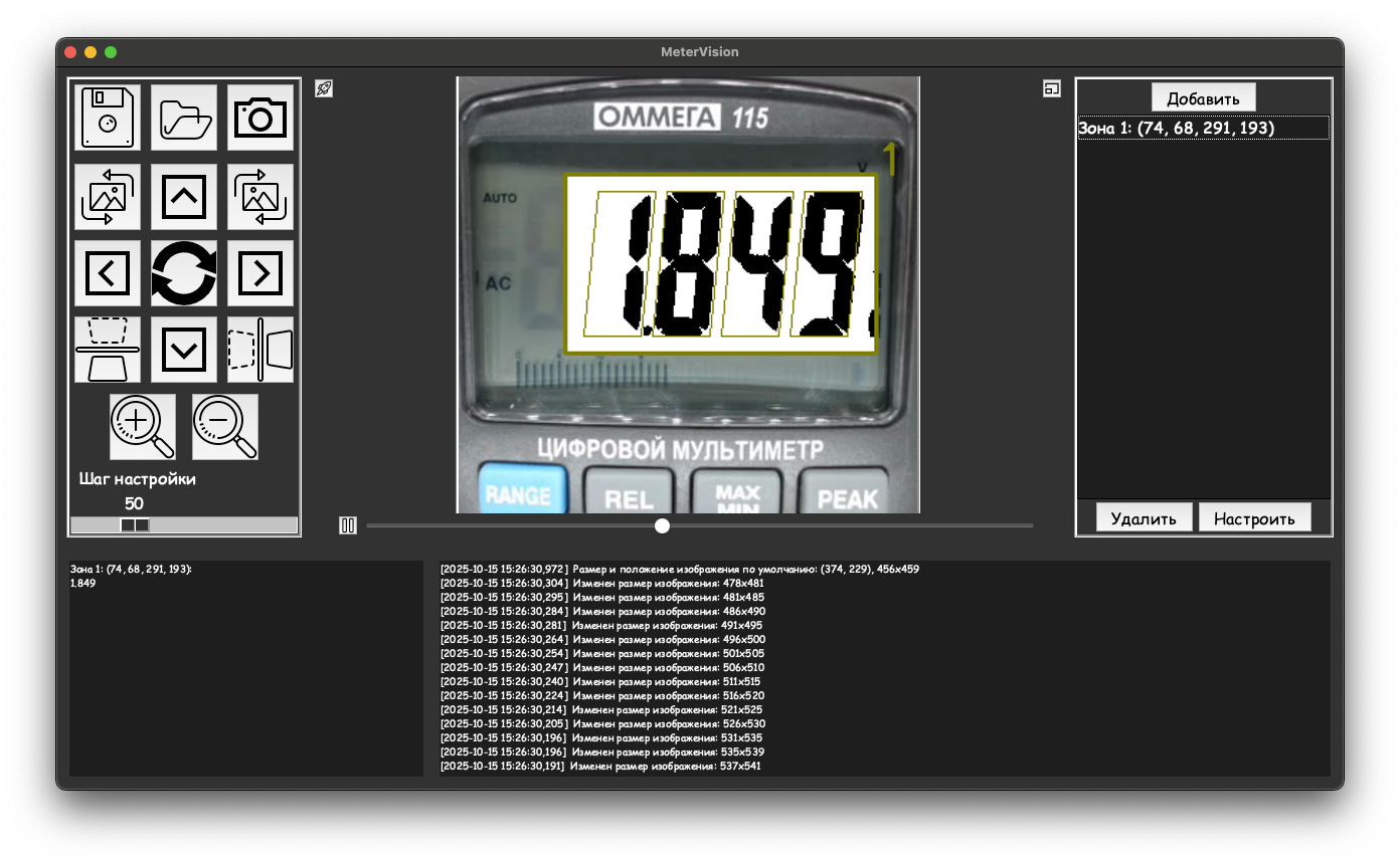 После каждого нового кадра, на котором была найдена прямая, описывающая стрелку, значение центра уточняется. Таким образом, если средство измерение плавно перемещается в кадре, то центр также перемещается. Но, если произошел сильный сдвиг (на величину больше, чем Мак. отклонение), то новый центр не будет найден вообще. В этом случае следует начать обработку сначала с помощью кнопки Забыть статистику зоны. Также данные о фоне не сохраняются при сохранении настроек зон, поэтому если вы открываете ранее сохраненные настройки зон, то дайте время программе для вычисления фона
