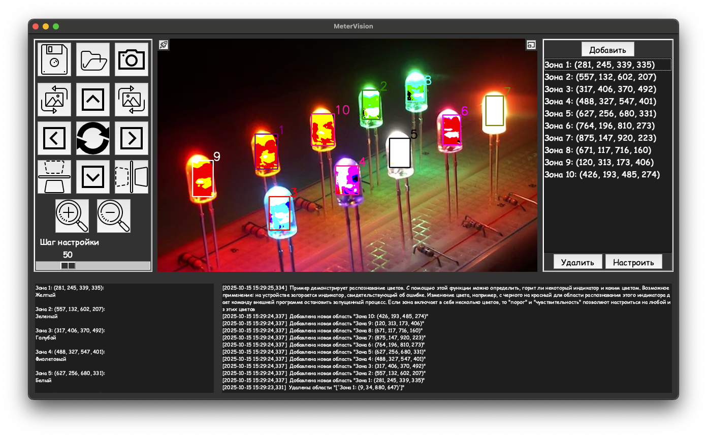 Например, если чувствительность имеет значение 100, то достаточно 1 пикселя каждого цвета, чтобы считать, что в зоне этот цвет есть, поэтому в результате распознавания цвета зоны с такой чувствительностью всегда будет белый (при смешение красного, зеленого и синего будет белый).